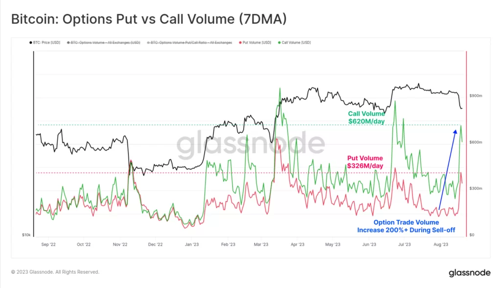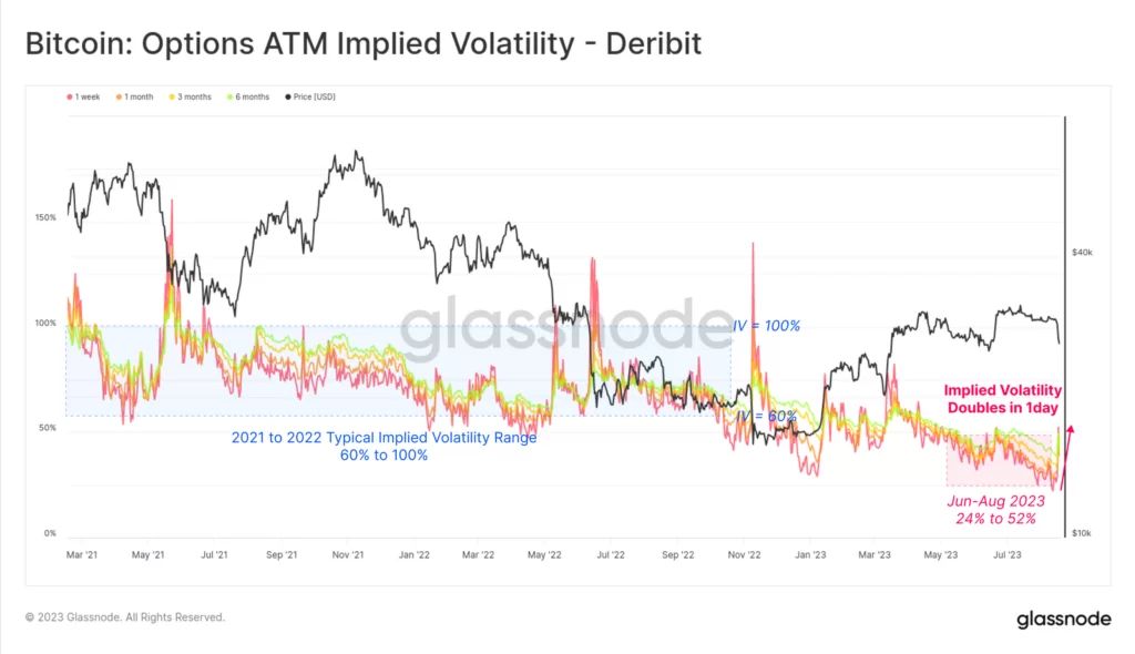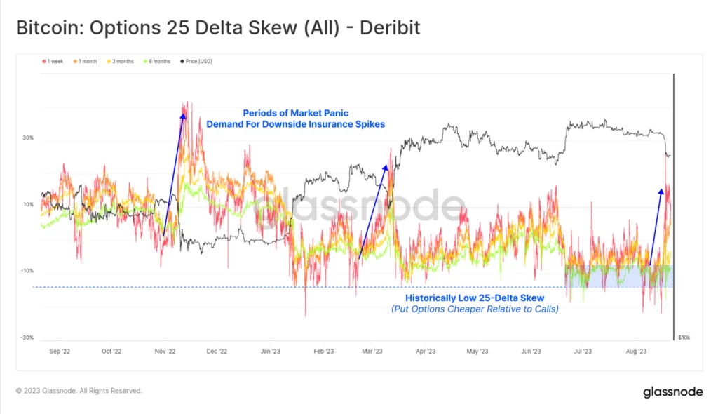 Źródło: GlassnodeImplikowana zmienność ceny Bitcoina na rynkach opcji osiągnęła najniższy poziom w historii na początku tygodnia. Znalazła się 50% poniżej długoterminowego poziomu bazowego z lat 2021-22. Oczywiście, gdy rozpoczęła się wyprzedaż, zmienność została gwałtownie przeszacowana. Wzrosła ponad dwukrotnie w przypadku kontraktów krótkoterminowych z terminem wygaśnięcia do końca września. To potężny ruch, choćby zestawiając go z danymi historycznymi od jesieni 2022 roku.