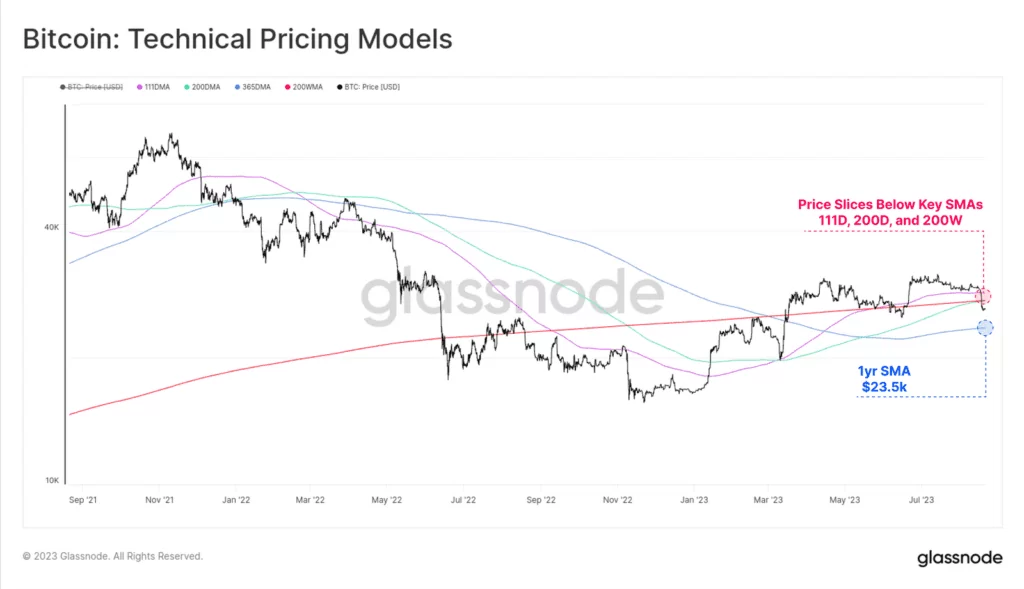 Kryptowalutowe byki mają przed sobą bardzo trudne zadanie. Po kilku tygodniach konsolidacji w przedziale 29,000 – 30,000 USD Bitcoin wszedł w trend spadkowy. Cena tąpnęła i przecięła kilka długoterminowych średnich kroczących, w tym 111-dniową, 200-dniową i 200-tygodniową. Rynek opcji od tygodni wskazywał na większą szansę spadków, a zmienność znalazła się na historycznych minimach. Biorąc powyższe pod uwagę, tym bardziej istotna wydaje się akcja cenowa z ostatnich dni.