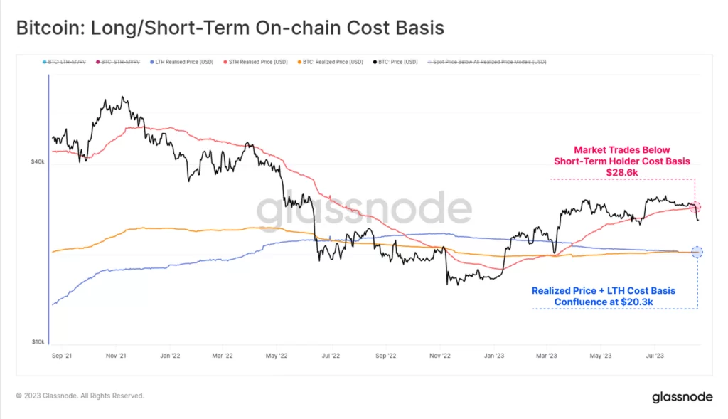 Źródło: GlassnodeWyprzedaż zepchnęła ceny poniżej średniej ceny kupna BTC przez krótkoterminowego inwestora. Wielokrotnie wcześniej poziom ten stanowił wsparcie podczas silnych trendów wzrostowych. Zważywszy, iż cena zrealizowana (średnia cena kupna wszystkich BTC) i podstawa kosztowa długoterminowego inwestora znajdują się przy 20,000 USD Glassnode wskazuje, iż rynek znalazł się w nieco niepewnej sytuacji z psychologicznego punktu widzenia. Zdecydowana większość inwestorów krótkoterminowych kupiła BTC po cenach powyżej 29,000 USD.