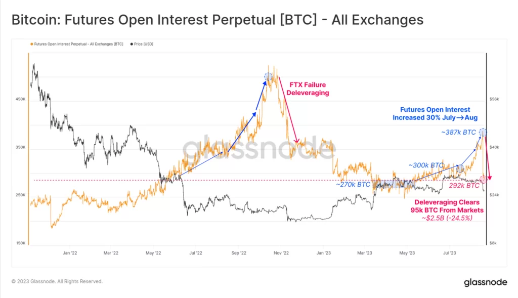 Źródło: GlassnodeInwestorzy z rynku kontraktów terminowch doświadczyli poważnego delewarowania, które ma podobieństwa zbliżone do krachu FTX. Mimo mniejszej skali, kontrakty futures o wartości nominalnej ponad 2,5 mld USD zostały zamknięte w ciągu jednego dnia. To spadek o -24,5% i całkowite usunięcie całej dźwigni finansowej gromadzonej w czasie od lipca do sierpnia. Pozycje zamykały zarówno byki jak i niedźwiedzie.