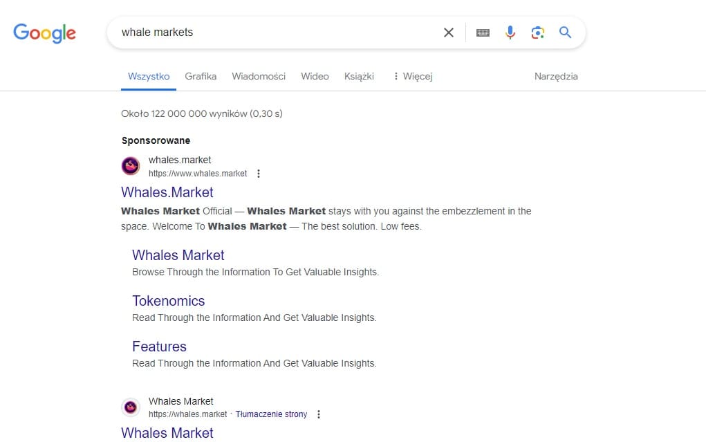 Według raportu BleepingComputer niezidentyfikowana grupa oszustów wykorzystuje Google Ads do reklamowania fałszywej wersji strony Whales Market. To popularna platforma kryptowalutowa, która ułatwia handel tokenami, pochodzącymi z airdropów. Zaatakowana wersja witryny pojawia się jako sponsorowana reklama na samej górze wyników wyszukiwania Google. Dlatego bardzo łatwo wpaść w tę pułapkę.