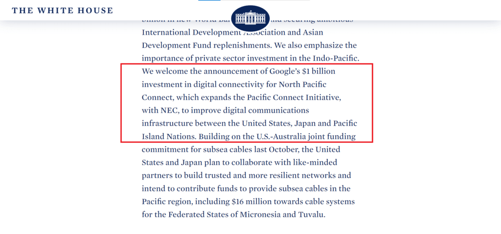 Google położy dwa nowe kable podmorskie po dnie Oceanu Spokojnego. Mają one połączyć Amerykę, Japonię oraz rozmaite terytoria wyspiarskie na Pacyfiku. O supremację w tym regionie – w tym sferze komunikacji oraz w odniesieniu do pacyficznych państw wyspiarskich – zabiegają też Chiny.