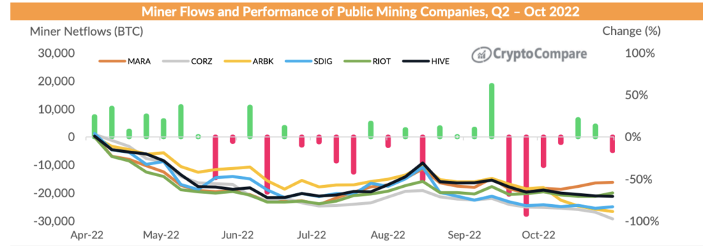 W ciągu ostatnich 6 miesięcy firmy wydobywcze branży kryptowalutowej jak Marathon Digital czy HIVE Blockchain sprzedawały swoje aktywa bazowe, przy czym ostatnia duża sprzedaż miała miejsce w połowie października. Wykres nie pokasuje jeszcze w pełni sytuacji 'po FTX’. Źródło: CryptoCompare, Cointelegraph
