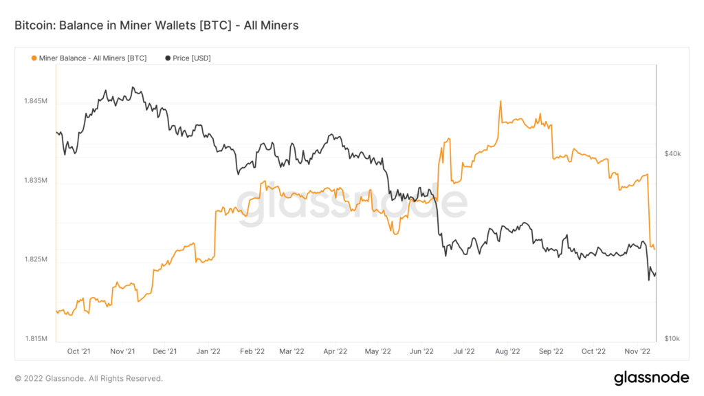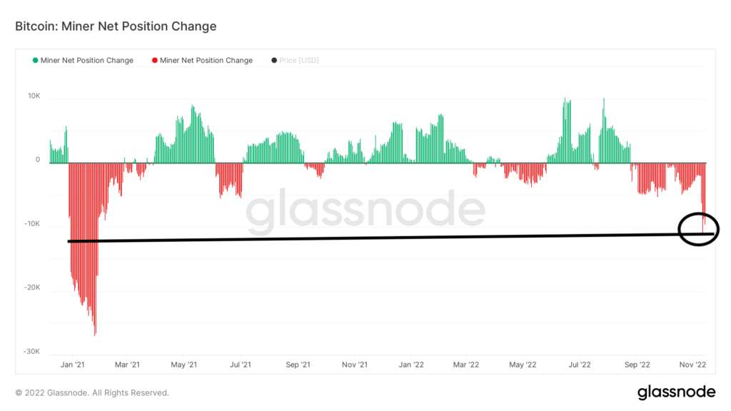 Portfele górników rozpoczęły sprzedaż z chwilą upadku FTX i ponownym spadkiem BTC poniżej 20 000 USD. Później było adekwatnie już tylko gorzej. Źródło: Glassnode