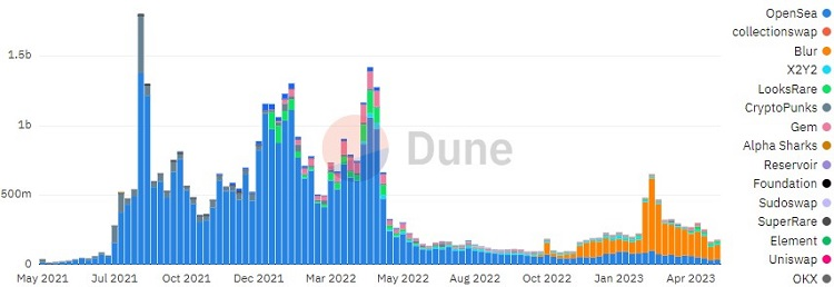 Dane dostarczone przez Dune Analytics pokazują, iż w 2023 roku odnotowano odrodzenie wolumenu transakcji na rynkach NFT. Jednak w porównaniu z 2022 rokiem, aktywność handlowa NFT pozostaje znacznie poniżej szczytów obserwowanych podczas hossy w 2021 roku.