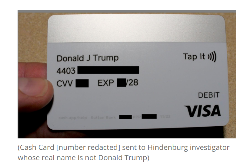 Karta płatnicza Block, którą jeden z pracowników Hindenburg Research był w stanie założyć… Na dane Donalda Trumpa. Źródło: HindenburgResearchCo z CashApp ?