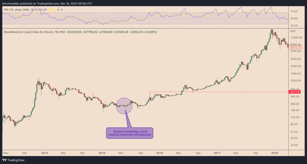 Kiedy Grecja stanęła w obliczu podobnego kryzysu w 2015 roku i nałożyła kontrolę kapitału na obywateli, aby uniknąć paniki na banki, cena Bitcoina wzrosła o 150%.