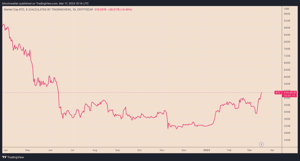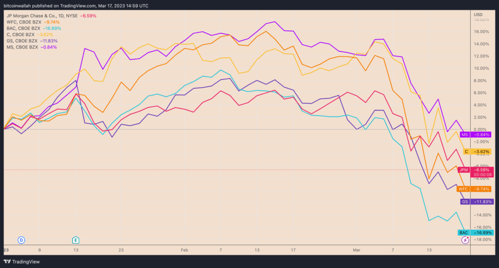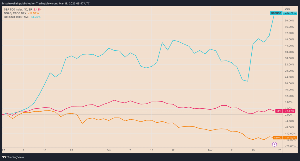 Kapitalizacja rynkowa Bitcoina zwiększyła się o 194 miliardy dolarów w 2023 roku. 66% wzrost kursu BTC od początku roku (YTD) znacznie przewyższa akcje czołowych banków z Wall Street, zwłaszcza iż rosną obawy przed globalnym kryzysem bankowym.