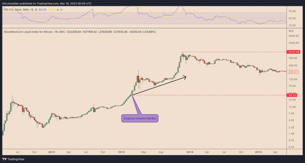 Podczas cypryjskiego kryzysu finansowego w 2013 roku cena BTC wzrosła o 5000% . Kryzys był spowodowany ekspozycją cypryjskich banków na regionalne spółki z branży nieruchomości, które były nadmiernie lewarowane.