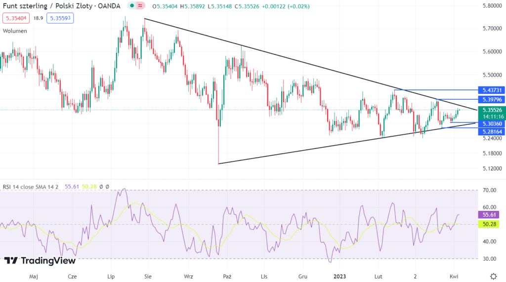 Obecna cena funta do złotówki (GBP/PLN) wynosi 5,356.Kurs funta od 31 marca 2023 roku znajduje się w impulsie wzrostowym. Kurs GBP/PLN znalazł się blisko górnego ograniczenia trendu spadkowego. Zatem ciekawym miejscem do zajęcia krótkiej pozycji jest poziom 5,37. jeżeli ten poziom zostanie przebity, to kolejną strefą podaży znajduje się w okolicy maksimum z 20 marca 2023 roku (5,40). Kolejny opór znajduje się w okolicy szczytu z 14 lutego (5,4377). Ważnym wsparciem jest solne ograniczenie trendu wzrostowego, który jest “podstawą” trójkąta. Istotne wsparcie znajduje się w okolicy minimum z 30 marca (5,2997). Kolejną strefą popytu znajduje się w okolicy dołka z 23 marca (5,2775).