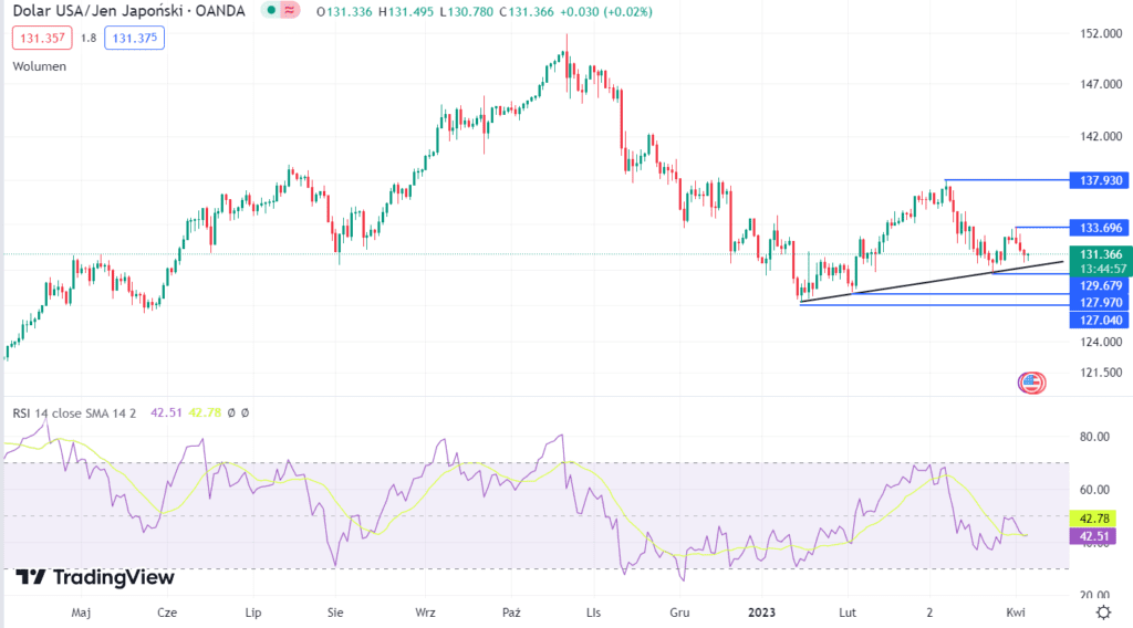 Od 3 kwietnia 2023 roku kurs USD/JPY znajduje się w trendzie spadkowym. Kurs USD/JPY znajduje się w okolicy linii trendu wzrostowego poprowadzonego po dołkach z 16 stycznia oraz 2 lutego. Najbliższe wsparcie znajduje się w okolicy 130,4. Kolejne wsparcie znajduje się niedaleko dołka z 24 marca (129,64). W tych okolicach znajdują się dobre miejsca do zajęcia długiej pozycji. W przypadku realizacji scenariusza wzrostowego kolejnym celem dla byków jest szczyt z 3 kwietnia (133,76). jeżeli niedźwiedziom uda się przebić dołek z 24 marca, niedźwiedzie będą miały otwartą drogę do przetestowania dołka z 2 lutego (128,08).