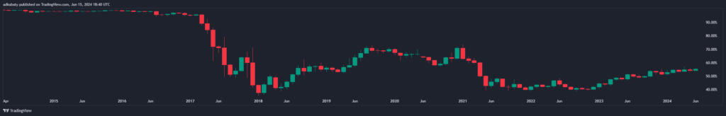 Wykres BTC.D, czyli „dominacji Bitcoina nad altcoinami”, źródło: TradingViewPrzyznać należy, iż okres czteromiesięczny to trochę za krótko, aby wysuwać daleko idące wnioski (w końcu „altsezon” z prawdziwego zdarzenia jeszcze nie miał miejsca). Niemniej jednak, biorąc pod uwagę, iż były to kryptowaluty niemal całkowicie przypadkowe, a interwał również brany ad hoc, eksperyment potwierdza tezę, iż wybranie Bitcoina i Ethereum (i bezpieczeństwo oraz spokój umysłu) ponad koszyczek altcoinów może być jak najbardziej „optymalnym” pomysłem na nadchodzącą hossę.