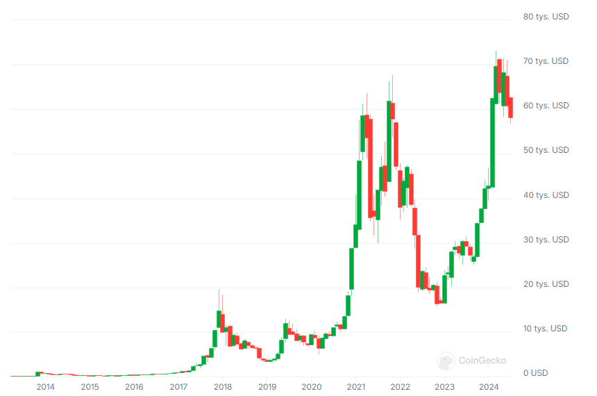 Cena Bitcoina na przestrzeni lat, źródło: CoingeckoKryptowaluty kontra akcje: starcie tytanów