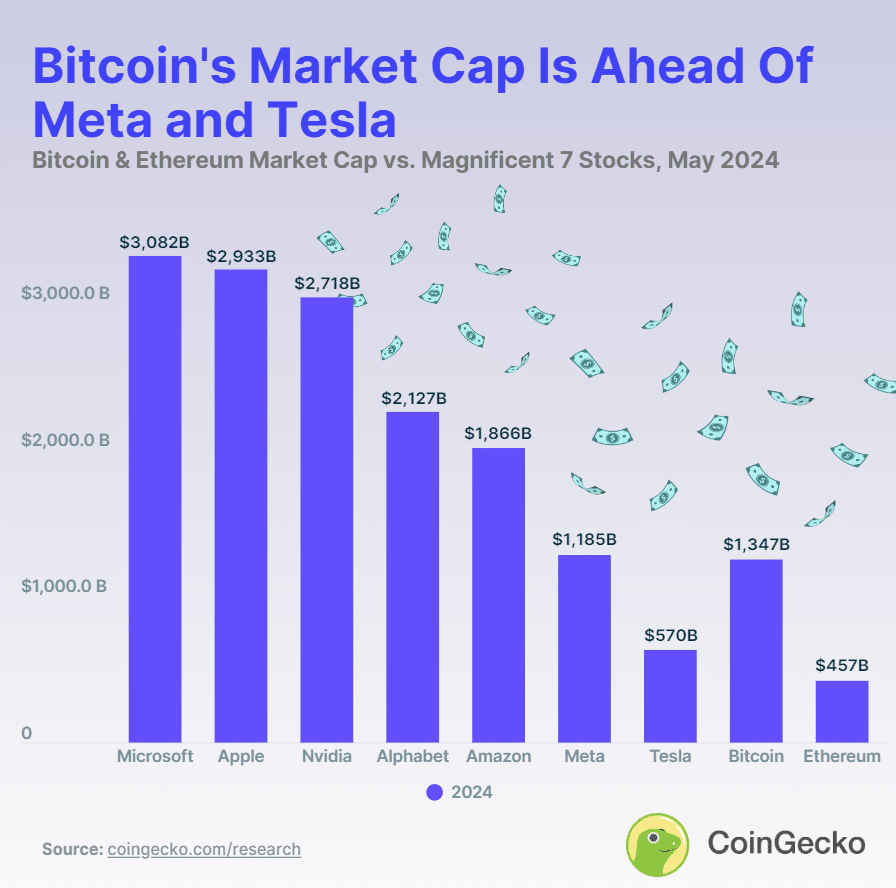 Jednak zarówno Bitcoin, jak i Ethereum pokonały większość akcji należących do „Wspaniałej Siódemki”. Wystrzał Ethereum był zbliżony do, choć gorszy, od wyników Nvidii, podczas gdy wyniki Bitcoina są porównywalne z wzrostem Tesli o 1340,8%.