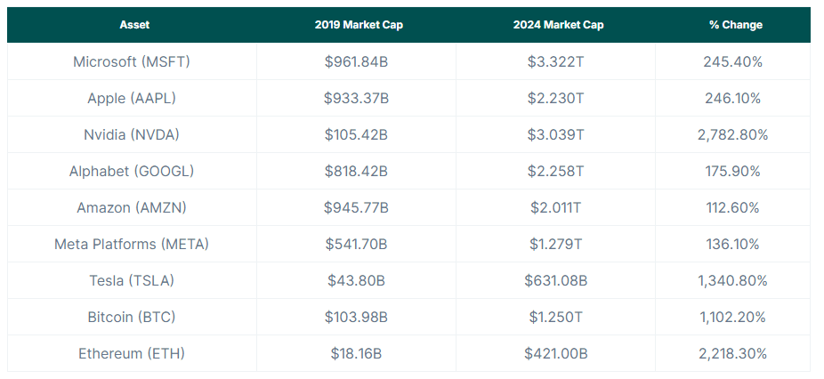 Porównując wyniki głównych kryptowalut z „Wspaniałą Siódemką”, można łatwo dostrzec interesujące schematy. Po pierwsze, Nvidia okazała się najlepszym rajdowcem spośród wszystkich aktywów ze swojej niszy, z imponującym skokiem kapitalizacji całkowitej o 2782,8% w ciągu pięciu lat.