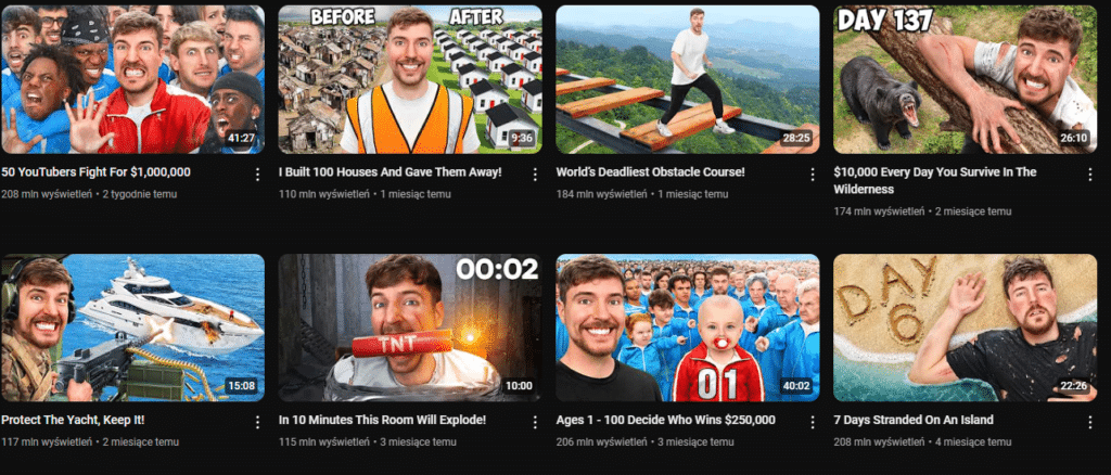 Kolaż filmów na kanale Jimmy’ego Donaldsona, źródło: youtube.comChoć YouTube jest głównym źródłem dochodów MrBeasta, nie ogranicza się on wyłącznie do tej platformy. W 2020 roku zadebiutował z grą mobilną „Finger on the App”, a także uruchomił sieć wirtualnych restauracji MrBeast Burger. Ponadto, w 2022 roku wprowadził na rynek markę spożywczą Feastables, która oferuje m.in. czekolady.