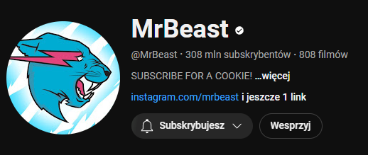 Statystyki subkrybcji na kanale YouTube MrBeasta, źródło: youtube.comZdecydowana większość dochodów MrBeasta pochodzi z reklam na YouTube, sponsorowanych treści oraz różnych przedsięwzięć biznesowych. W 2021 roku prestiżowy Forbes oszacował jego roczne zarobki na około 54 miliony dolarów, głównie pochodzących z reklam. Jednak raport z 2024 roku przygotowany przez magazyn Fortune wskazuje, iż jego roczne przychody mogą sięgać już aż 700 milionów dolarów. W tej kwocie mieszczą się przychody z różnych źródeł, w tym ze współpracy z markami, sprzedaży towarów oraz przedsięwzięć sygnowanych marką własną MrBeast.