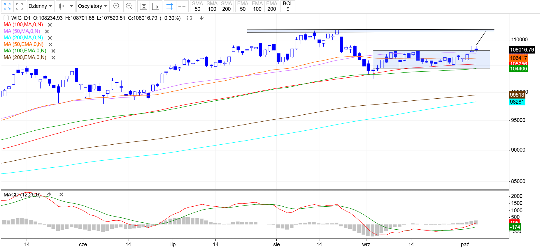Pamiętamy ten wąski kanał na Wig-u. W trakcie ostatnich dwóch sesji kurs próbował się z niego wydostać i w sumie to się udało. Nie jest to jakieś przekonywujące wyłamanie, ale jednak zawsze. Czy to oznacza iż teraz kurs będzie próbował atakować maksima? Tak to powinni wyglądać, ale jakoś w 100% nie jestem przekonany.