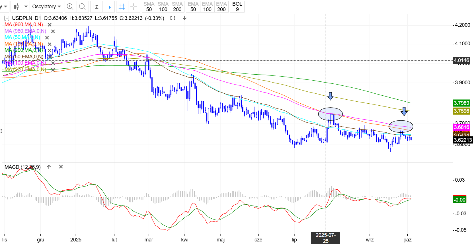 Para usd/pln po dotarciu do okolic 100 dniowych zostaje podobnie jak przy poprzedniej próbie zatrzymana przez podaż. Żeby cokolwiek się zmieniło ten schemat musi zostać zburzony. Do tego czasu w szerszej perspektywie mamy cały czas trend spadkowy, a opadające średnie ten trend prowadzą stanowiąc zaporę dla popytu.