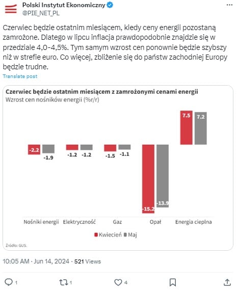 Niestety wiele wskazuje na to, iż czerwiec będzie kolejnym miesiącem, w którym inflacja wzrośnie, a choćby sporo przyspieszy. Jak możemy przeczytać w prognozie PIE na X: „Czerwiec będzie ostatnim miesiącem, kiedy ceny energii pozostaną zamrożone. Dlatego w lipcu inflacja prawdopodobnie znajdzie się w przedziale 4,0-4,5%. Tym samym wzrost cen ponownie będzie szybszy niż w strefie euro. Co więcej, zbliżenie się do państw zachodniej Europy będzie trudne”.