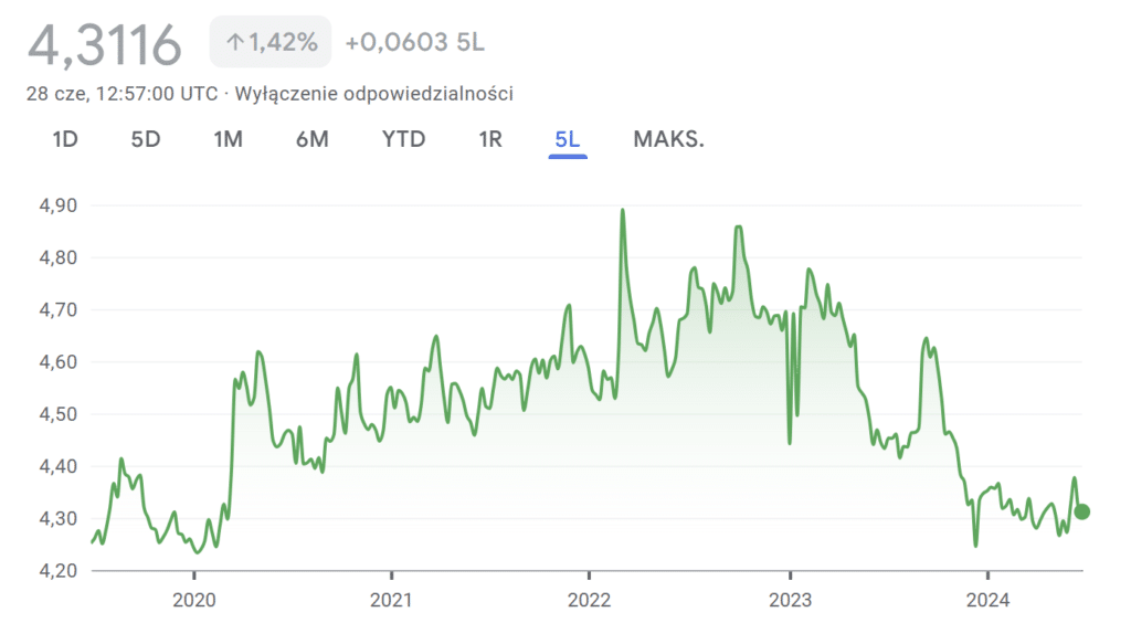 Wykres pary walutowej EUR/PLN w ujęciu pięcioletnim, źródło: Google
