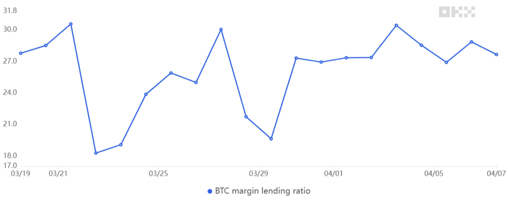Powyższy wykres pokazuje, iż wskaźnik depozytu zabezpieczającego inwestorów OKX utrzymywał się na poziomie blisko 28x na korzyść pozycji długich BTC w ciągu ostatniego tygodnia. Gdyby „wieloryby” i animatorzy rynku dostrzegli zwiększone ryzyko korekty ceny, pożyczyliby Bitcoina, powodując spadek wskaźnika poniżej 20x.