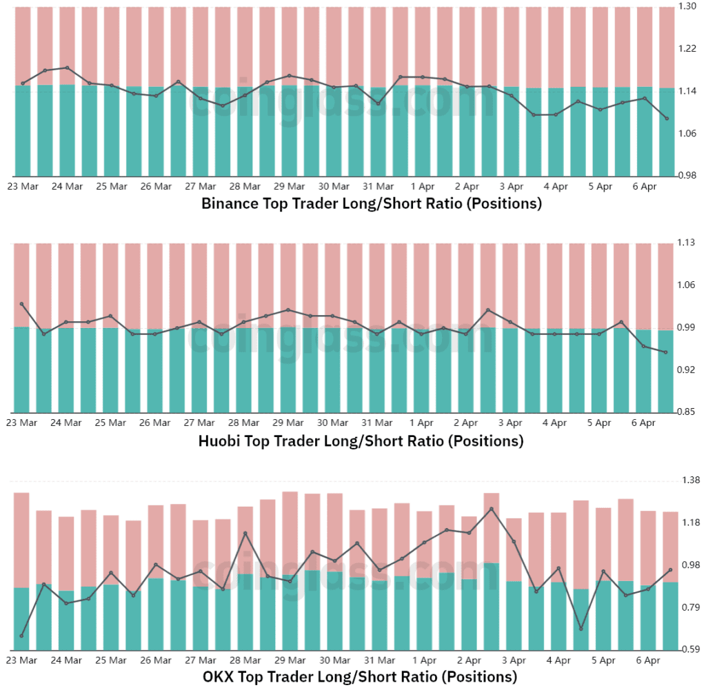 Między 1 kwietnia a 7 kwietnia stosunek pozycji długich do krótkich na Binance nieznacznie spadł z 1,17 do 1,09. Tymczasem na giełdzie Huobi stosunek pozycji długich do pozycji krótkich u najlepszych traderów od 18 marca wynosił blisko 1,0. Dokładniej rzecz biorąc, stosunek ten spadł z 1,00 1 kwietnia do 0,95 7 kwietnia. I jest względna równowaga między pozycjami długimi i krótkimi.