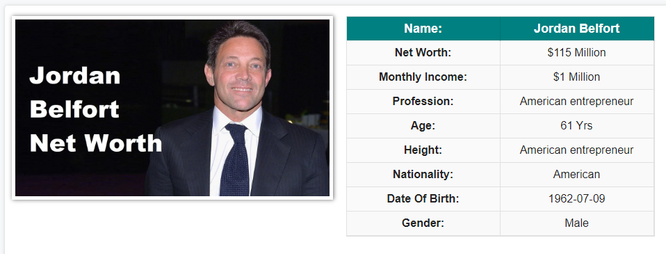 Jordan Belfort, niesławny „Wilk z Wall Street” w którego wcielił się w filmie z 2013 r. Leonardo DiCaprio, posiada aktualną tzw. wartość netto w wysokości około 115 milionów dolarów. Pomimo burzliwej przeszłości naznaczonej problemami z prawem i wyrokami skazującymi za oszustwa, Belfort zdołał zgromadzić niemałą fortunę, wykorzystując rozgłos do zarabiania na dochodowych przedsięwzięciach w rozmaitych sektorach.