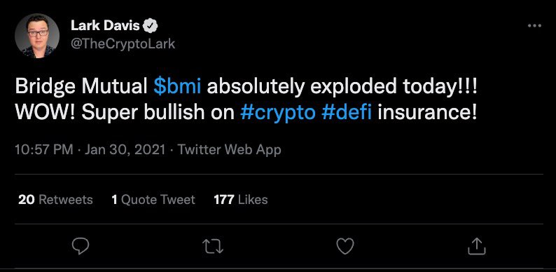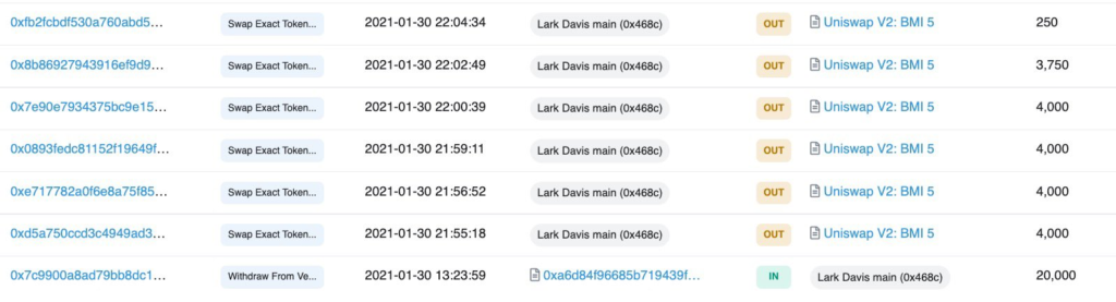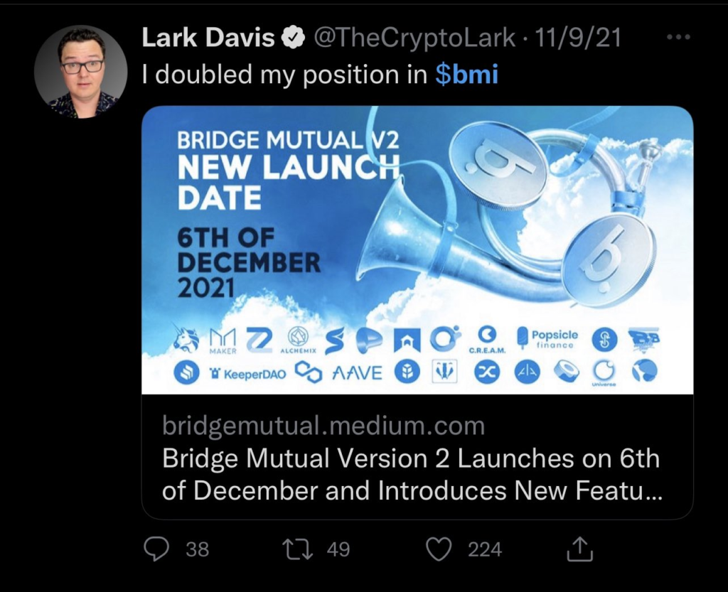 W dniu 9/10 listopada, 2021 Lark zatweetował, iż podwoił swoją pozycję na tokenie BMI. Podczas gdy jest to całkowicie możliwe. Nie podwoił swojej pozycji z głównego portfela.