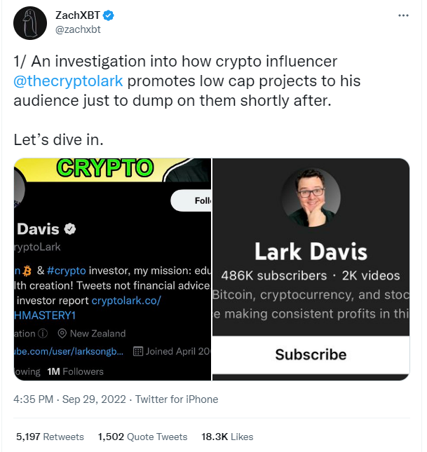 Dochodzenie w sprawie tego, jak mający blisko 500 tys. influencer kryptowalutowy Lark Davis promuje projekty o niskiej kapitalizacji dla swoich odbiorców tylko po to, aby niedługo potem zarobić na nich sprzedając. Zanurzmy się.