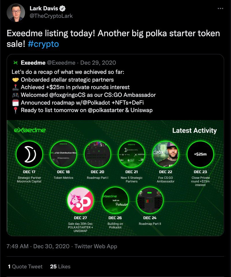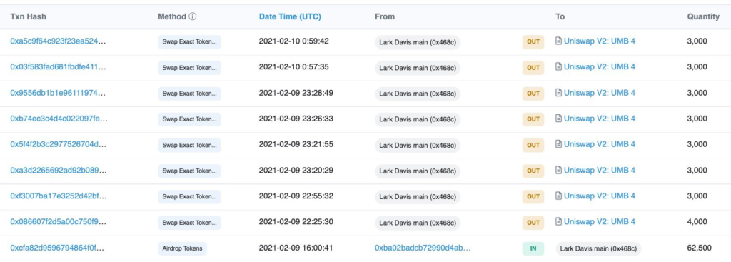 Lark tworzy filmik na YT o „100x low cap gems” (ang. małe tokeny z potencjałem 100 krotnego wzrostu) 12 lutego 2021 roku, po czym przystępuje do sprzedaży swoich tokenów tego samego dnia.