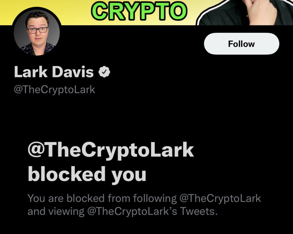 ZachXBT wskazuje, iż Lark Davis go zablokował. Popularna praktyka wśród oszustów i naciągaczy. Źródło: Twitter