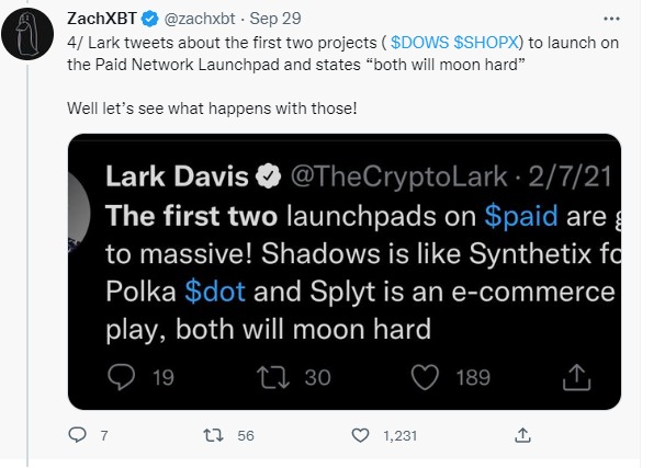 Lark tweetuje o dwóch pierwszych projektach DOWS i SHOPX, które wystartują na Paid Network Launchpad i stwierdza „both will moon hard” (ang. „ich ceny niebawem potężnie wzrosną”). No to zobaczymy co się z nimi stanie!