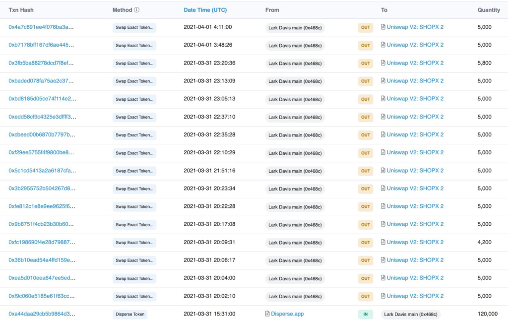 a) 31 marca 2021 o godz. 15:31 UTC Lark otrzymuje 120 tys. tokenów SHOPX