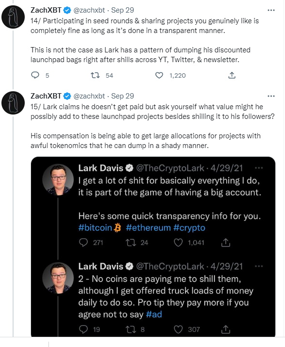 Lark twierdzi, iż nie dostaje pieniędzy. Ale zadaj sobie pytanie, jaką wartość może dodać do tych projektów launchpadowych, oprócz przekazywania ich swoim zwolennikom? Jego wynagrodzenie to możliwość otrzymania dużych alokacji na projekty z okropną tokenomią, których może pozbyć się w nieuczciwy sposób.