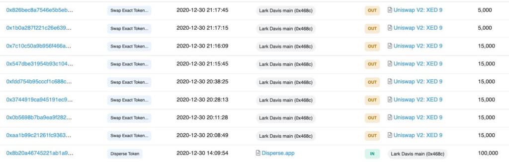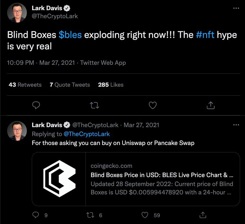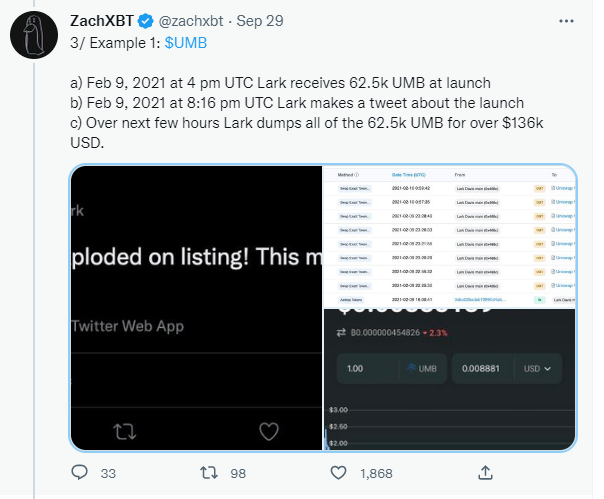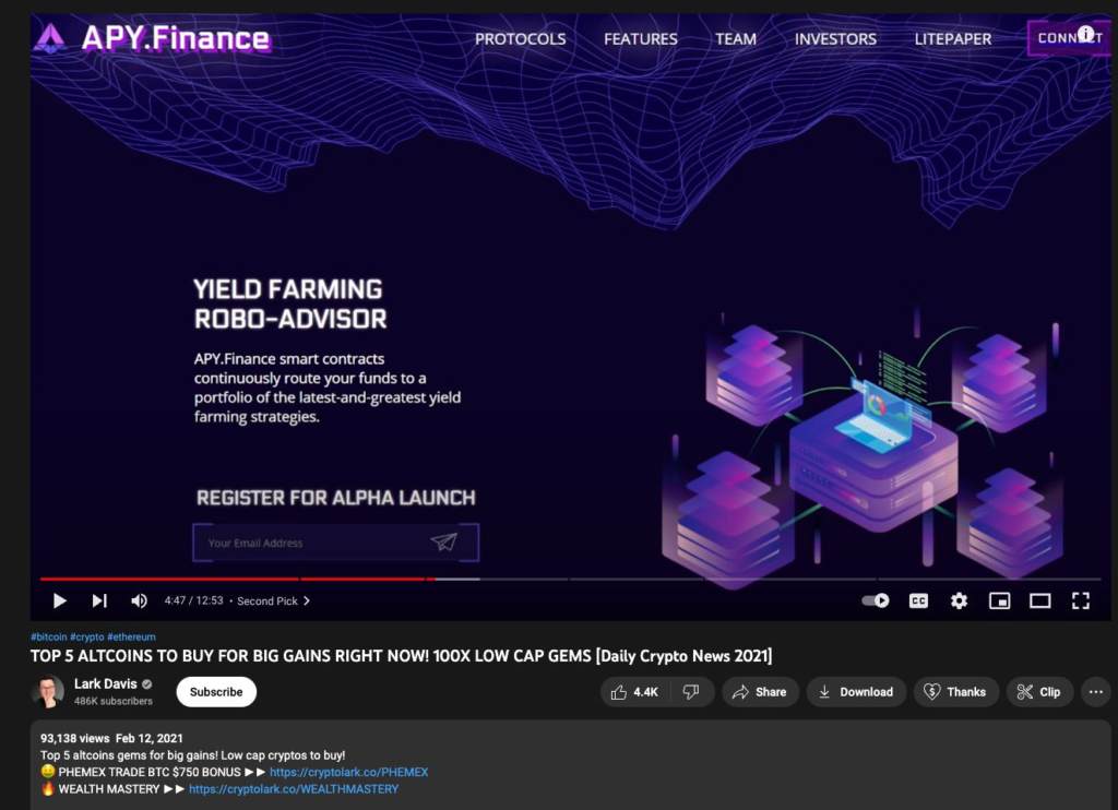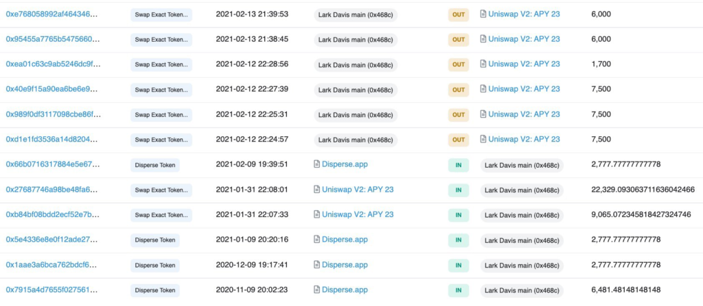 Lark tworzy filmik na YT o „100x low cap gems” (ang. małe tokeny z potencjałem 100 krotnego wzrostu) 12 lutego 2021 roku, po czym przystępuje do sprzedaży swoich tokenów tego samego dnia.