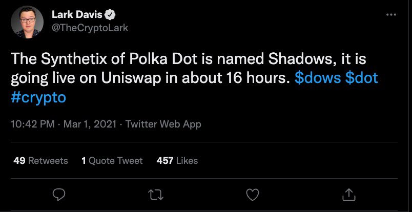 b) 1 marca 2021 o 22:42 UTC Lark tweetuje, iż projekt wystartuje za 16 godzin