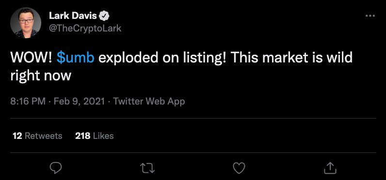 a) 9 lutego 2021 o 16:00 UTC Lark otrzymuje 62,5 tys. tokenów UMB na start