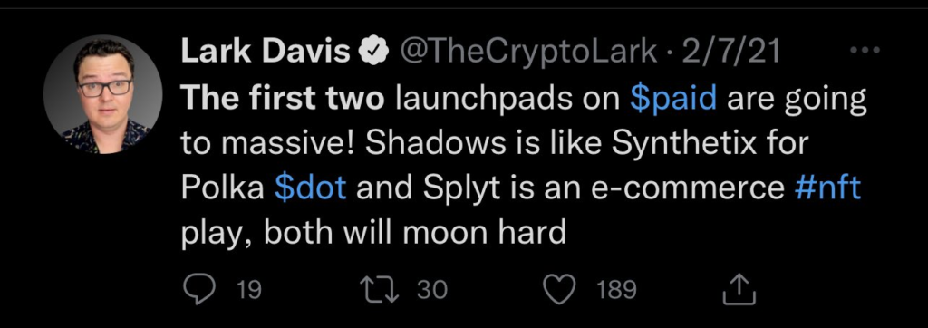 Oto co stało się z tokenem Umbrella UMB. Źródło: Coingecko, TwitterLark tweetuje o dwóch pierwszych projektach DOWS i SHOPX, które wystartują na Paid Network Launchpad i stwierdza „both will moon hard” (ang. „ich ceny niebawem potężnie wzrosną”). No to zobaczymy co się z nimi stanie!