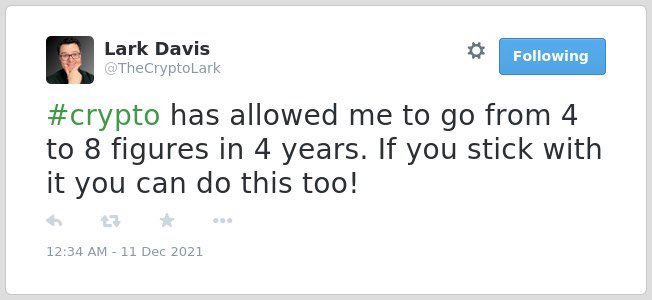 Lark twierdzi, iż dzięki kryptowalutom zamienił swoje 4 cyfrowe konto w 8 cyfrowe w 4 lata. jeżeli będziesz się go trzymał, też tak możesz!