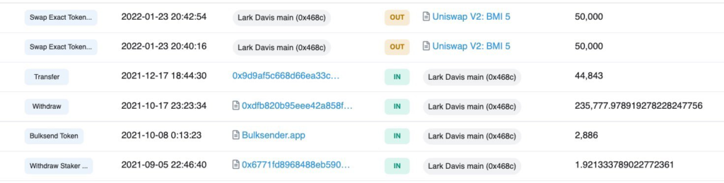 W dniu 9/10 listopada, 2021 Lark zatweetował, iż podwoił swoją pozycję na tokenie BMI. Podczas gdy jest to całkowicie możliwe. Nie podwoił swojej pozycji z głównego portfela.