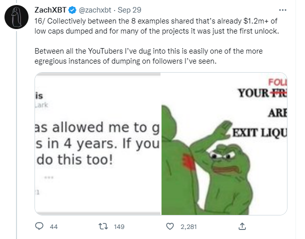 Wszystkie powyższe zrzuty Davisa dały mu mniej więcej 1,2 mln USD przychodu z tych małych kryptowalut. Dla wielu spośród tych projektów był to tylko pierwszy unlock. Pomiędzy wszystkimi YouTuberami, których się dokopałem, jest to z pewnością jeden z bardziej rażących przypadków dumpingu przeznaczonego dla swoich zwolenników, jakie widziałem – podkreśla ZachXBT.