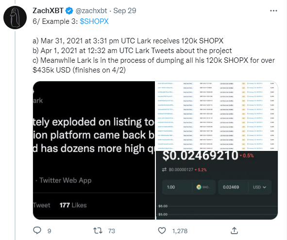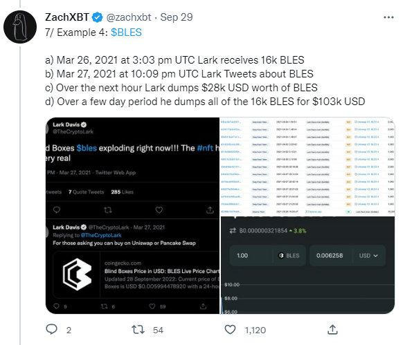 Uczestniczenie w rundach początkowych i dzielenie się projektami, które naprawdę lubisz, jest całkowicie w porządku, o ile odbywa się w sposób przejrzysty. W tym przypadku nie ma to miejsca, ponieważ Lark ma wzór wyrzucania swoich fatalnie zaprojektowanych tokenów zaraz po nakręcaniu spirali chciwości na YT, Twitterze i newsletterze.