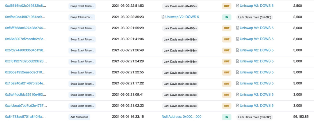 a) 1 marca 2021 o 16:23 UTC Lark otrzymuje 96 tys. tokenów DOWS