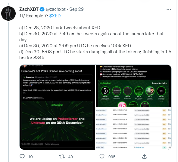 ZachXBT wskazuje, iż Lark Davis go zablokował. Popularna praktyka wśród oszustów i naciągaczy. Źródło: TwitterPrzykład 6: XED