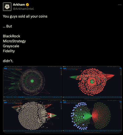Byli jednak i tacy, którzy bez problemu wytrzymali „ciśnienie” i nie potrzebowali do tego ETF-ów. 5 sierpnia 2024 r. Arkham opublikował post na X, w którym stwierdził, iż giganci zarządzania aktywami, tacy jak BlackRock, Fidelity, Grayscale i MicroStrategy, zachowują spokój pomimo ogromnego krachu na rynku. Mówiąc wprost: nie sprzedali niczego. Przynajmniej tak wynika z oficjalnych danych.
