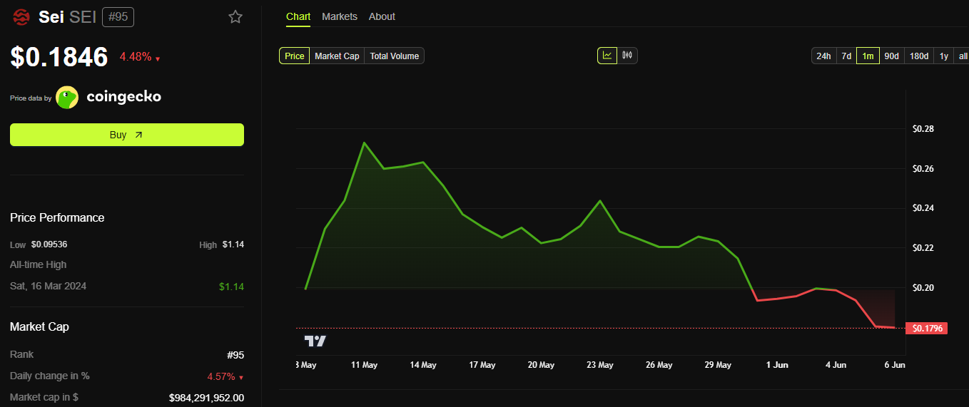 Mimo silnego rozwoju ekosystemu cena SEI nie oddaje tego wzrostu. Według BeInCrypto cena SEI spadła o ponad 30% w maju 2025 roku. Ten spadek wzbudził obawy wśród inwestorów.