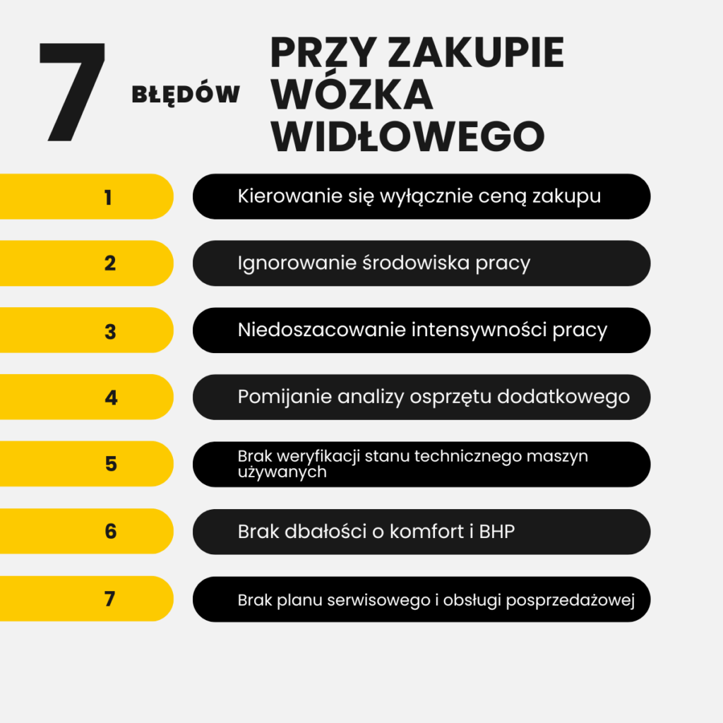 7. Brak planu serwisowego i obsługi posprzedażowej – w przypadku zarówno nowych, jak i używanych wózków brak przygotowania do regularnego serwisowania skraca żywotność sprzętu i zwiększa koszty TCO.