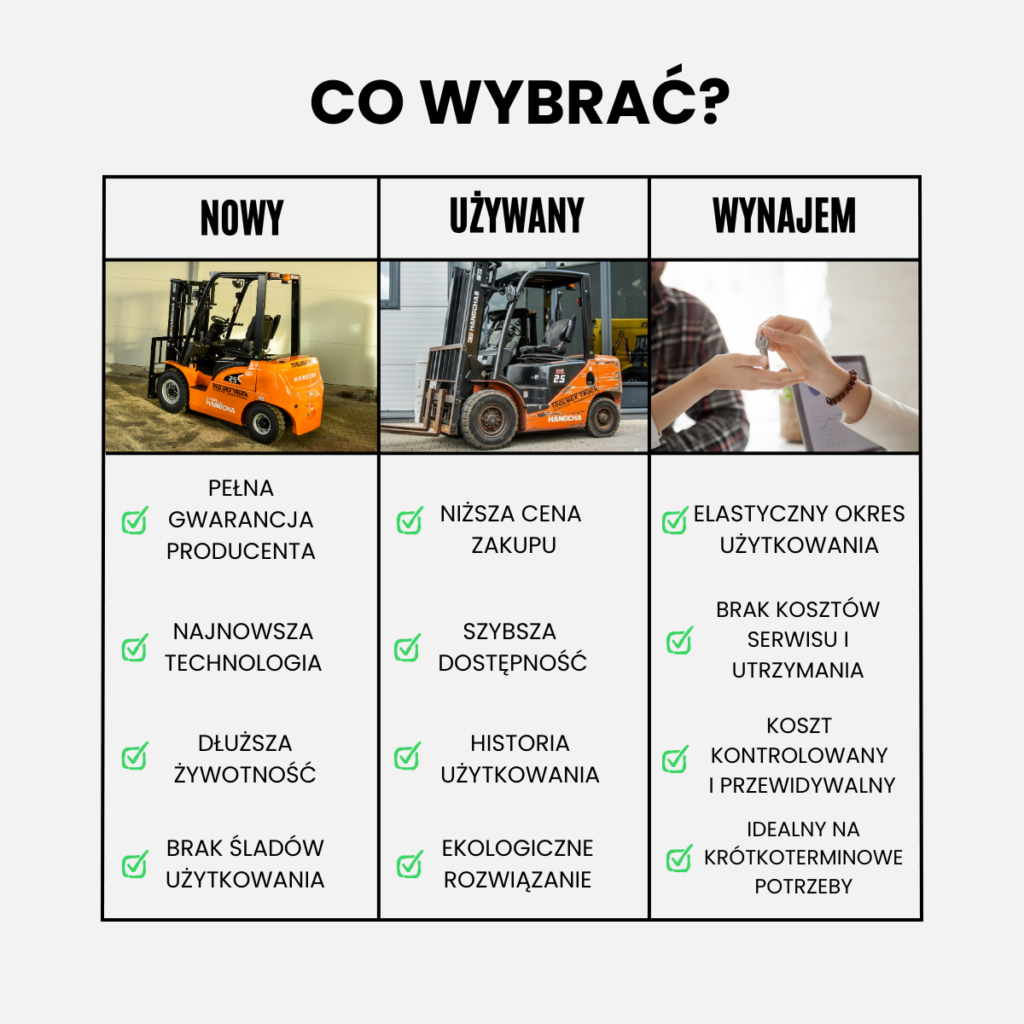 Każde z rozwiązań ma sens w innych warunkach. Używany wózek może być opłacalny przy niskiej intensywności pracy, a wynajem sprawdza się przy projektach czasowych lub sezonowych.