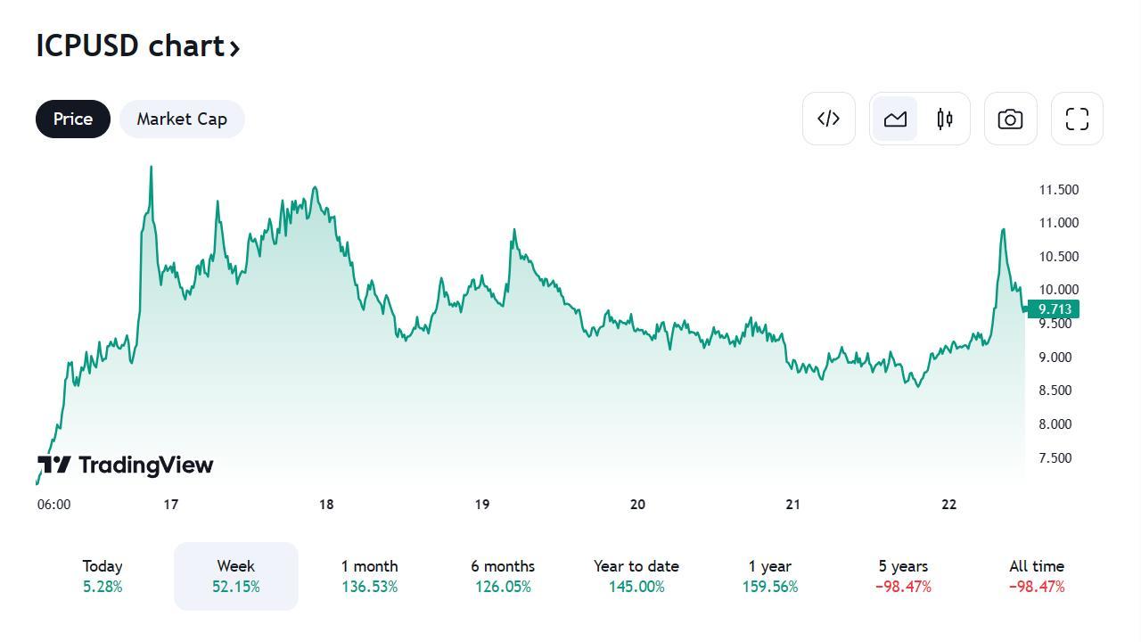 Cena ICP waha się między 6,34$ a 13,26 $. 10-dniowa średnia krocząca wynosi 9,21$, a 100-dniowa średnia krocząca 7,13$, co wskazuje na trend wzrostowy.